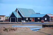 Fishing became a more important occupation after 1855 when the Danish–Icelandic Trade Monopoly was abolished and patterns of settlement changed greatly.[3] The village's heyday was from the mid-19th century to the early 20th century but with improved public transport and occupational opportunities the number of inhabitants decreased. Because of that, many houses from 1890 to 1920 have been preserved; those little houses of the common people characterize the village.[6][7] Not far from the Folk Museum is the church (1890) where the altarpiece is worthy of notice. It is given and painted by the Danish queen Louise of Hesse-Kassel.[8]