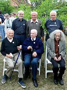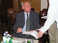 After his presidency, Göncz completely retired from politics and resided in a state residence at Béla király Street along with his wife until his death in October 2015.[131] In September 2000, he was appointed President of the Hungary in Europe Foundation which awarded literary prizes annually.[132] He gave a speech on 23 October 2000, where he told "the proliferating phrases during annual commemorations had overshadowed the actual events of the 1956 revolution."[133] In November 2000, Göncz became an honorary citizen of Budapest, awarded by the city's Mayor and fellow SZDSZ member Gábor Demszky.[134] In December 2000, a prize was founded by the United States, named after Göncz. U.S. Secretary of State Madeleine Albright awarded the Göncz Prize to Erika Csovcsics, headmistress of the Gandhi School for the first time.[135]