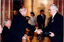 Göncz was an avid supporter of Hungarian integration with the West, especially with the United Kingdom.[70] In May 1990, Charles, Prince of Wales and his wife Diana undertook an official visit to Hungary and made history by becoming the first members of the British royal family to visit a former Warsaw Pact country.[73][74] The royal couple were met at the airport by their host, newly elected interim President Göncz,[74] who later hosted an official dinner to welcome the royal couple.[74] Elizabeth II visited Hungary in May 1993, also welcomed by Göncz.[75] He argued in favor of Hungary's accession to NATO and the European Union. He was also an enthusiastic supporter of U.S. President Bill Clinton's "Partnership for Peace" in Central Europe.[76] As a result, in 2000, he was honored with the Vision for Europe Award for his efforts in creating a unified Europe.[77] Göncz's commitment towards the Western world earned some domestic negative criticism; in 1991, the far-right politician István Csurka, later defector from MDF and founder of the nationalist Hungarian Justice and Life Party (MIÉP) accused him of being a tool of France, Israel, and the United States.[17] During Göncz's presidency, Pope John Paul II visited Hungary twice, in August 1991 and September 1996. They had already known each other through a common Polish friend, before John Paul's papacy.[78]