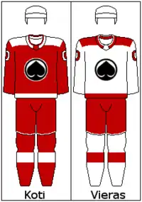 The Porin Ässät were established in June 1967 when two local sports clubs Rosenlewin Urheilijat-38 and Porin Karhut merged their sports operations. Although the RU-38 won the SM-sarja championship in 1967, the Rosenlew company seriously considered giving up sports activities, as Rosenlew felt that hockey did not bring enough positive publicity to the company. The leaders of Karhut and RU-38 negotiated the unification of the clubs during the spring and early summer so secretly that even the insiders of the teams did not get to know about the merger negotiations. The problem for the Karhut was the economic downturn, as the club had heavily invested in player acquisitions. The income was not enough to cover the expenses, especially after some supporters had moved to the Rosenlew club.[1] As Rosenlew was abandoning the sports club, it was suggested that the RU-38 was simply "melted" into Karhut. When an agreement was finally reached, Rosenlew took over a large portion of Karhut's debts and promised to support the new team financially in the early years. The new club was named Porin Ässät. The birth of the club was announced at the end of June 1967. The name of the club was given by Vilho Santala, who acted as a negotiator in uniting the clubs and was elected the first chairman of Ässät. The club's logo was designed by Vesa Antikainen. The colors of the club were chosen as red, black and white.[2]