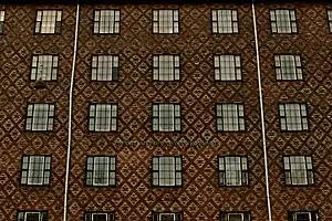 The Functionalist apartment building Trekanten ("The Triangle") on the rounded corner of Åboulevard and Rosenørns Allé was designed by Kay Fisker.[3] In collaboration with C. F. Møller, Fisker also designed the neighbouring housing estate, Hermanhus, which consists of two buildings surrounding a greenspace called Hermann Triers Plads ("Hermann Trier's Square"). The bay windows are typical of his Functionalist style. The buildings were listed in 1981.