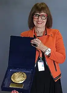 Åse Marie Frøyshov (born 1943) is a Norwegian textile artist. Working principally with different types of brightly coloured wool, she has created non-figurative carpets and wall hangings including "Fanfare", an enormous woven wall display for the Tomsø Music Conservatory. Her tapestries often consist of patches arranged in collage-like patterns, extending beyond the edges of a rectangular frame.[1][2] Textiles for churches, such as altarpieces, altar cloths, rugs and chasubles, can be seen in Rennebu's Innset Church and in Hamar Cathedral.[3] At the 2021 Florence Biennale, Frøyshov was awarded the prize for "Textile and Fiber Art".[4]