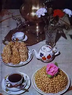 Çäkçäk (pronounced [ɕækˈɕæk], Yañalif: Cəkcək, Tatar Cyrillic: Чәкчәк[1] or чәк-чәк, çäk-çäk; Tajik: чақчақ, chaqchaq; Kyrgyz: чак-чак; Uzbek: chak-chak; Russian: чак-чак, chak-chak; Bashkir: сәк-сәк, sək-sək, Kazakh "шәк-шәк", frequently anglicized as chak-chak (/tʃækˈtʃæk/). It is particularly popular in Tatarstan and Bashkortostan, and is recognized as Tatarstan's national sweet in Russian Federation.