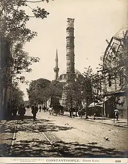 Çemberlitaş was originally the site of one of the forums that dotted Divan Yolu. The original Forum of Constantine was an oval-shaped public arena surrounded by porticoes and filled with statuary. In 330, when he decided to make Byzantium the capital of the Eastern Roman Empire, the Emperor Constantine had a porphyry column erected in the middle of the forum with a statue of himself as Apollo on the top of it. The column was badly damaged by an earthquake in 416 since when it has been held together by iron bands. The statue on the top survived until 1106 when it was replaced with a large cross that survived until the Conquest of İstanbul in 1453.[1] I