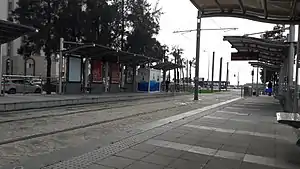 Çevreyolu is a light-rail station on the Karşıyaka Tram line of the Tram İzmir network.[1] The station consists of two side platforms serving two tracks. Çevreyolu is located on 8291st Street, just off of Caher Dudayev Boulevard, in Ataşehir, Çiğli and gets its name from the O-30 beltway (Turkish: Çevreyolu) running just north of the station. Çevreyolu station was opened on 11 April 2017, along with the entire tram line.[2]