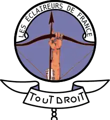 The bow and arrow were chosen as emblems by the founders of the Eclaireurs de France in 1911. The trefoil is for the girls and women. The four colours (orange, green, red, blue) represent the four age groups.[1]