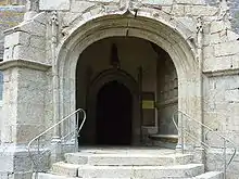 The Église Sainte-Geneviève de Loqueffret is a Roman Catholic parish church located at Loqueffret, situated in the arrondissement of Châteaulin and the department of Finistère in Brittany in north-western France. The parish church of Loqueffret was built in granite in the Gothic style in the 16th century and is dedicated to Saint Geneviève, a 10th-century Breton saint. The calvary dates to the 15th century. The existing bell-tower dates to 1771 and the bell-tower spire was designed by the architect Joseph Bigot and dates to 1850. The church has two large entrances on the west and south side. [1][2]