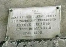 Plate that says in occitan : "In this house the troubadour Etienne Pélabon, Maniclo's