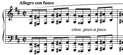 8 time, played at a very fast tempo of Allegro. The second theme is in B minor's parallel major, B major, and in triple metre. The second theme is repeated four times, and develops into a variation of the first theme, returning to cut time and B minor.