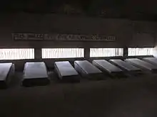 The mausoleum, on the other hand, is considerably more spacious. It has two entrances, allowing a continuous flow of visitors during ceremonies. The gravestones are made of grey granite and are slightly inclined. They are lit by horizontal skylights at the top, which are fitted with randomly-arranged iron bars. An inscription, "Let eternal light shine on them", is placed just above the window wells. The roof, which is set much lower than the one on the chapel, is composed of two thin hyperbolic paraboloid sails supported by a central beam and the walls. Two gargoyles on each side of the monument keep rainwater away from the structure.[11]