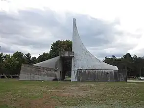 The Evêques-de-Trois-Rivières mausoleum is located in the center of the Saint-Michel cemetery in Trois-Rivières.[1] Its installation here is no accident, for the 1962 cemetery plans by landscape architects Benoît Bégin and Georges Daudelin foresaw a chapel in this location. It is set in a large open space offering multiple views of the mausoleum across the cemetery. The main view remains the main axis of the cemetery from the entrance. Architect Jean-Claude Leclerc exploited this perspective by creating a gap in the monument, allowing the cemetery's calvary to be seen from the entrance.[2]