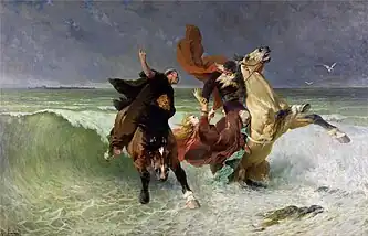 Having met Théodore Hersart de La Villemarqué, who had published a collection of popular Breton songs, Barzaz Breiz, around 1884 he based on one of the songs his Flight of King Gradlon, depicting the king fleeing on horseback from his city of Ys as it is swallowed by the sea; St. Winwaloe urges him to jettison his only child, Dahut. The art museums in Quimper, Rennes and Nantes hold several sketches for the work. Exhibited at the Salon of 1884, the painting was hailed as a "superb dramatic group, full of life".[22]