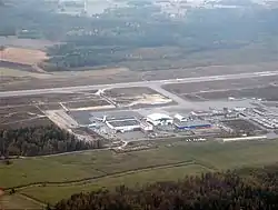 A coach service is operated by Let's Go By Bus Örebro between the airport and Örebro Central, with services timed to coincide with the Ryanair flights to and from London Stanstead on Mondays and Fridays. Tickets can be bought on the bus or on the FlixBus website.[5] The nearest public bus stop, (about 2 km away) has services to and from the centre of Örebro. It is served by bus 620 on weekdays and bus 600 at weekends.[6] Other transport alternatives will likely involve a car or taxi. Most flights are tourist charter which attracts child families who mostly use their car for transport. There are many parking spaces, which have a fee.