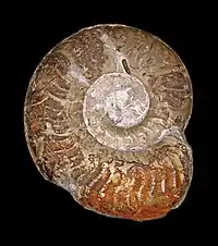 There is a rhodochrosite ore, composed of laminated gray, green, brown, and black sections, and is associated with a diagenetic origin.[24] Rhodochrosite concretions with fish and plant fossils are common on the strata, composed by Mn-bearing Calcite with traces of hydroxyl-apatite, kutnohorite, smectite, quartz, feldspar, barite, pyrite, and quartz-cristobalite.[24] Mineralized sections do not contain fossils or traces of benthic fauna, and contain only rarely fish remnants, planktonic organisms as well as silicified, manganized, or coalified plant fragments.[25]