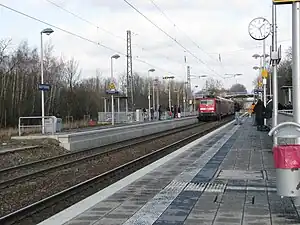 Übach-Palenberg station is in Übach-Palenberg on the southern edge of Heinsberg in the German state of North Rhine-Westphalia. It is located on the Aachen–Mönchengladbach railway on the western outskirts of Palenberg near the Wurm and is served by the Wupper-Express and the Rhein-Niers-Bahn. Its current form reflects its reconstruction and modernisation in the 1990s and in 2008. It is classified by Deutsche Bahn as a category 5 station.[1]