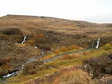 Þjórsárdalur (Icelandic pronunciation: [ˈθjour̥sˌaurˌtaːlʏr̥]) is a valley in Árnessýsla county in Iceland that lies between mount Búrfell alongside the river Þjórsá to the east and mount Skriðufell to the west. The valley is quite flattened over and pumicey after repeated eruption of the nearby volcano Hekla as well as other volcanoes in the vicinity like the Vatnaöldur volcanic system which produced Iceland's biggest known lavafield Þjórsá Lava (Þjórsárhraun) in prehistoric times or the Grímsnes volcanic system with the crater Kerið. Landmarks in Þjórsárdal include Þjóðveldisbærinn Stöng, Gjáin, Háifoss, and Vegghamrar.