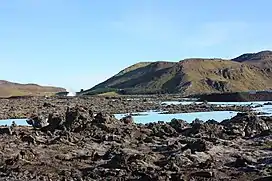 It is located within the area of the Reykjanes volcanic system and enclosed by Holocene lava fields. In addition, a visible tectonic graben[4] runs over the top of the mountain.[5] It builds a small canyon, up to 80 m deep.[6] As such, the mountain is a symbol of Reykjanes' geology in the whole.[7]