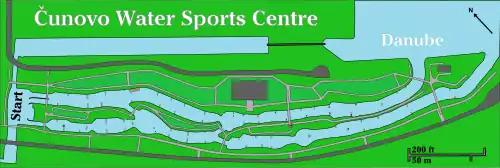 The Čunovo Water Sports Centre is an artificial whitewater slalom course in Slovakia, on an island in the Danube river, 14 km southeast of Bratislava, near the village of Čunovo. It is powered by flow diversion from the Čunovo dam. Since 1997, it has hosted a full schedule of local, regional, and international competitions, including multiple World Cup races, 2 European Championships and the 2011 World Championships.
