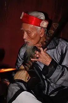 The đàn đáy (Chữ Nôm: 彈𡌠)is a Vietnamese plucked lute with three strings, a trapezoidal wooden body, and a very long wooden neck with ten raised frets. Players formerly used silk strings, but since the late 20th century have generally used nylon.[1][2]