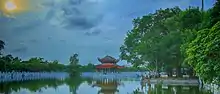 Entry into the complex is by the Five Dragon Gate (Ngũ long môn). Immediately after the gate is the Half Moon Lake (hồ bán nguyệt), so called because of its half-moon shape. At the front of the half-moon shaped lake stands a pavilion called Thủy Đình built into the lake which today hosts water puppet plays and quan họ singing.