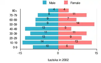 According to the 2002 Poland census, there were 171 people residing in Łaziska village, of whom 53.2% were male and 46.8% were female. In the village, the population was spread out, with 19.9% under the age of 18, 36.3% from 18 to 44, 22.2% from 45 to 64, and 21.6% who were 65 years of age or older.[1]
