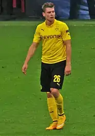 On 19 May 2010, Piszczek moved to Borussia Dortmund on a free transfer, signing a contract until June 2013.[10] On 26 July 2011, he signed a contract extension to keep him at the club until June 2016.[11] On 24 September 2011, he scored his first goal for his new German club, a last-minute volley to win the match away to Mainz 05 2–1.[12] In the 2012–13 season for Dortmund, Piszczek appeared in 11 out of 12 matches of Dortmund's road to the UEFA Champions League Final in 2013. He also started the final at right-back against Bayern Munich, but Dortmund lost by one goal after Arjen Robben scored an 89th-minute winner for Bayern.[13] On 27 January 2016, Piszczek signed a contract extension to keep him at the club until 2018.[14] On 6 April 2017, he extended his contract with Dortmund until 30 June 2019.[15]