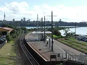 Ōrākei railway station in the Auckland suburb of Remuera is located on the North Island Main Trunk line in New Zealand. Eastern Line services of the Auckland railway network are the only services that regularly stop at the station. It has an island platform layout and can be reached by an overbridge from Ōrākei Road. It is backed by a car-park and a shopping complex.
