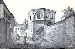 ![]() The mosque viewed from south in a drawing of 1877, from A.G. Paspates' Byzantine topographical studies | |