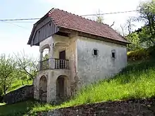 - The granary at Žerovnica no. 7 stands in the northern part of the village. It is a two-story stone structure with access to the upper level via a stairway on one side of the entry portico, which is supported by two columns. The granary has a tiled gabled roof.[10]