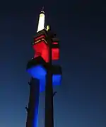 Since 2006, to mark the 125th anniversary of the elevation of Žižkov into a city and the 15th anniversary of the commissioning of the transmitter, the transmitter is illuminated in different colors every evening, usually in the colors of the state tricolor.[11]