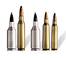 ![]() A comparison of the 243 WSSM with 243 Winchester (second from left) and with 22-250 and 223 Remington (far right). | ||||||||||||||||||||||||