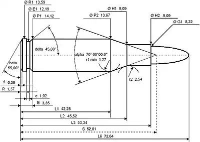 Americans would define the shoulder angle at alpha/2 ≈ 35 degrees. The common rifling twist rate for this cartridge is 254 mm (1 in 10 in), 4 grooves, Ø of the lands = 8.00 mm, Ø grooves = 8.20 mm, land width = 4.47 mm and the primer type is large rifle.[6]