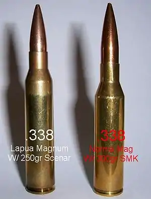 ![]() .338 Lapua Magnum cartridge next to a .338 Norma Magnum | ||||||||||||||||||||||||