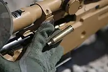The .338 Lapua Magnum has been designated a "cartridge of interest" by the National Defense Industrial Association (NDIA). It is being groomed to replace the .300 Winchester Magnum and the .50 BMG for anti-personnel long-range service in the U.S. military. On June 17, 2008, the U.S. government issued a market survey to support a requirement for a precision sniper rifle (PRS) to possibly replace the currently-fielded bolt-action SOF Sniper Syst's0126.[69][70] On 7 March 2013, the Remington MSR was declared the winner of the precision sniper rifle competition. Remington announced that the MSR had won on 8 March, and it was publicly confirmed on 9 March. This was followed by a $79.7 million contract for 5,150 rifles with suppressors, along with 4,696,800 rounds of ammunition to be supplied over the next ten years.[71][72] The contract was awarded on 12 September 2013. Remington Defense would produce the Mk 21 sniper rifles and utilized two other companies for other system components, with Barnes Bullets for ammunition and Advanced Armament Corporation for muzzle brakes and suppressors; all three companies are subsidiaries of Remington Outdoor Company. However, it was then decided that the Mk 21 did not conform to SOCOM requirements, and the program was re-competed with the Barrett MRAD selected in 2019 as the Mk 22 Advanced Sniper Rifle solution.[73] The US military opted to use 7.62×51mm NATO, .300 Norma Magnum and instead of the .338 Lapua Magnum the .338 Norma Magnum chambering in their Mk 22 rifles, which have a field-convertible barrel/chambering switch capability.