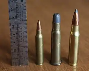 With the new Model 1886 lever-action rifle, and appearance of new smokeless powders on the market, in 1891, Winchester Repeating Arms Company started to experiment with necking down the .45-70 cartridge. The first attempt, a .31-62 with a 200-grain bullet, reportedly resulted in pressures too high for the action. Only a decade later, the desired result was achieved with a new caliber when the .33 Winchester was introduced in 1902.[1][3] Never popular due to lack of range despite high muzzle velocity (the 1886's tube magazine ensured that aerodynamic pointed-tip bullets couldn't be used except while single loading), the only other firearms offered in this chambering were the Winchester Model 1885 and Marlin Model 1895.[1][4] The round was eventually replaced by the .348 Winchester in 1936, and ultimately discontinued by Winchester in 1940,[4] although it is still currently produced in small numbers by other ammunition manufacturers.[1]