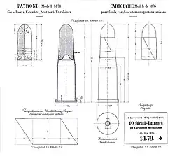 In 1867, the Swiss military adopted the 10.4×38mmR cartridge. As one of the few rimfire cartridges to see military service, the 313 grain bullet and 1,400 fps muzzle velocity was respectable compared to its contemporaries. The most popular arms chambered for this round were the Vetterli series of rifles. This type of round was also used in the 1867 Peabody.[2] Adopted in 1869 along with the Vetterli turn-bolt rifle, it was discontinued, along with the rifle, in 1889. With a 334 gr (21.6 g; 0.76 oz) bullet, it is adequate for deer, and only at short range.[1]