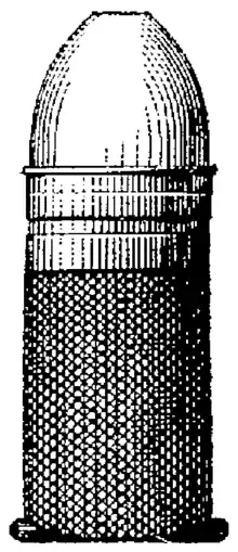 The nomenclature of Spencer cartridges was unique. Unlike later cartridges such as the .44-40 Winchester and .45-70, where the first number indicated caliber and the second the charge weight, the .56-56 refers solely to the case. The first 56 is the diameter of the case at the base .56 inches (14.2 mm), measured just past the rim, and the second 56 is the diameter at the case mouth, also 0.56 inches (14 mm). Later versions of the cartridge included the .56-52, .56-50, and .56-46, which had varying degrees of taper in the cases, to accommodate smaller diameter bullets. All of these cartridges are rimfire primed. The actual bullet diameter of the .56-56 varied between .54 and .555 inches (13.7-14.1 mm), depending on ammunition manufacturer. The .56-52, made by Spencer, and the .56-50, made by Springfield, differed only in the degree of crimp, with the .56-50 having a greater crimp; both fired 350-grain (23 g) .512-inch (13.0 mm) bullets. The .56-46 fired a 320-grain (21 g) - 330-grain (21 g) .465-inch (11.8 mm) bullet.[1]
