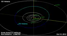 This object is orbiting the Sun with a period of 4.16 years and an eccentricity of 0.14. Its orbital plane is inclined by 10.2° to the plane of the ecliptic. Radar observations were made of this object on Oct 7 and 19, 2001 from the Arecibo Observatory. Analysis of the data gave an estimated ellipsoidal diameter of 71×63×63 ± 16% km. The mean diameter estimated from IRAS infrared measurements is 66 km, in agreement with the radar findings. It is classified as an S-type asteroid in the Tholen system,[3][5] suggesting a predominantly silicate composition. 101 Helena is spinning on its axis with a period of 23 hours.[2]