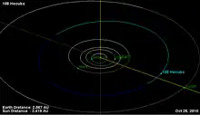 Hecuba (minor planet designation: 108 Hecuba) is a fairly large and bright main-belt asteroid. It was discovered by Karl Theodor Robert Luther on 2 April 1869,[7] and named after Hecuba, wife of King Priam in the legends of the Trojan War in Greek Mythology. This object is orbiting the Sun with a period of 5.83 years and an eccentricity of 0.06. It became the first asteroid discovered to orbit near a 2:1 mean-motion resonance with the planet Jupiter,[8] and is the namesake of the Hecuba group of asteroids.[9]