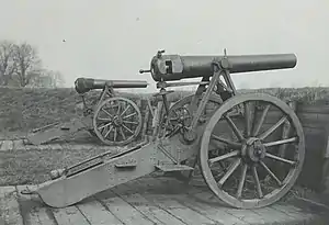 In early 1870 the Dutch field artillery was very backward. In March 1871 the Minister for Defense therefore sent two artillery officers to Switzerland to study a new bronze breech loading field gun of 84 mm caliber. These officers bought a gun (the 8.4 cm Feldgeschütz Ord 1871) and 500 shot in Winterthur.[4] In early 1872 the gun arrived and was successfully tested against the Dutch 8 cm rifled muzzle loader.[5] Judging by its appearance the 12 cm A No. 2 gun seems to have been modeled on the 8.4 cm gun.
