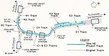 The station initially had one side platform on each level, with one track on the east side of each platform. The KE Track project, begun in 1980 and completed on March 17, 1986, converted the upper platform to an island platform with a new west track (Track CX).[11][5] The new track was originally used for peak hour service (southbound towards San Francisco in the morning, and northbound in the evening).[12]