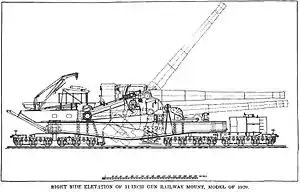 The primary difference from the earlier Navy versions lies in the M1920 carriage, which could be raised and lowered. Prepositioned fixed mounts were installed at the forts, and the gun's rail trucks could be taken out from under the frame. After the removal of the rail trucks, the gun was lowered and bolted onto a pivot point for rapid 360 degree movement, necessary for tracking ships in coast defense. The M1920 carriage made the gun much more flexible. It allowed for the standard practice of using a curved piece of rail to traverse the gun, and it enabled the gun to be used in a fixed position.[1]