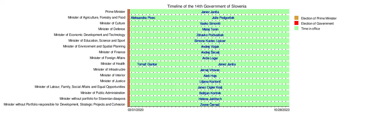 The 14th Government of Slovenia was formed following the resignation of Prime Minister of the 13th Government Marjan Šarec in January 2020. Janez Janša of Slovenian Democratic Party formed a coalition with Modern Centre Party, New Slovenia, and Democratic Party of Pensioners of Slovenia. The government was confirmed on 13 March 2020, amidst the COVID-19 pandemic.