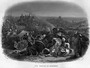 On the 17th of February 1843, as part of Sir Charles Napier's advance guard of his expeditionary force to conquer the province of Scinde, the Scinde Horse came across the forward elements of the combined forces of the Waziri tribals of Sind, led by Mir Nuseer Khan, entrenched in the Fulaillee Nala, near Meeanee, 23 miles ahead of Hyderabad, the capital town of Sind. Along with the Scinde Horse, there were amongst others, 5 Raj Rif (Napiers Rifles), the Cheshire Regiment and the Poona Horse, bringing up the rear, with the Madras Engineers providing engineering support. Not to be deterred, the regiment reconnoitred the area and made an outflanking move through dense forest and broken country, most unsuitable for horses. In an unparalleled outflanking manoeuvre in which over 70 horses died of fatigue, the Scinde Horse surprised the enemy by appearing at their rear and routed them in a cavalry charge, capturing the principal standard of Mir Nuseer Khan in the process. Seeing their Standard captured, the enemy capitulated and Sind was conquered. Sir Charles Napier cryptically signalled back "Pecavi" (I have Sinned (Sind)).[3][9]