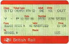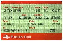 The next major changes came in 1987, with the discount structure, types of discounted tickets available and appearance of the Railcard all changing. With the introduction of the APTIS ticket issuing system happening at this time, a new set of ticket stock (with the British Rail form number BR 4599/20)A was introduced. These were smaller than the erstwhile handwritten square-cornered card tickets, and had no room for a photograph to be attached; a separate Photocard, with a unique serial number was introduced instead. This was issued together with the Railcard, and had to be shown when buying subsequent Railcards and when travelling on discounted tickets.[2]