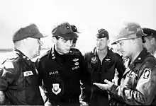 The brigade arrived in South Vietnam on 7 May 1965, the first major ground combat unit of the United States Army to serve in the country.[3][23][24][25][26][27] Williamson boldly predicted on arrival that his men would defeat the Viet Cong (VC) quickly and that they "would be back in Okinawa by Christmas".[21] The 1st Brigade, 101st Airborne Division; the 2nd Brigade, 1st Infantry Division; and the 1st Cavalry Division quickly followed the 173rd into Vietnam, the first of what would eventually be 25 U.S. Army brigades to serve in the country.[22][27] As larger US Army commands were established in Vietnam, the brigade was assigned to the III Corps and II Corps tactical zone, which they would serve in for the next six years.[28] The brigade was put under the command of II Field Force, Vietnam.[29]