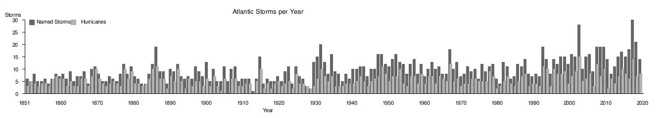 Atlantic tropical and subtropical cyclones that reach tropical storm intensity are named from a pre-determined list. On average, 10.1 named storms occur each season, with an average of 5.9 becoming hurricanes and 2.5 becoming major hurricanes, Category 3 or higher on the Saffir–Simpson scale. The most active season on record was 2020, during which 30 named tropical cyclones formed. Despite this, the 2005 season had more hurricanes, developing a record of 15 such storms. The least active season was 1914, with only one known tropical cyclone developing during that year.[5]