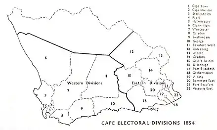 The first election for the Parliament of the Cape of Good Hope was held in 1854. There were no clear party lines, however many representatives for Eastern electoral districts subscribed to a common programme which emphasised separation from the Cape Colony or moving the seat of colonial government eastward, a vagrancy law, or increasing the property qualification part of the franchise (which would have reduced the number of non-Whites able to vote).[1]