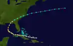 A sixth tropical storm was first observed by the brig Caroline E. Kelly on September 18, which experienced a heavy gale while located about 930 miles (1,500 km) east-southeast of Bermuda.[1] With initial winds of 60 mph (97 km/h), the storm slowly strengthened while moving north-northwestward. At 1200 UTC on September 19, it reached hurricane status and peaked with winds of 80 mph (130 km/h). The storm decelerated and remained at this intensity for over 24 hours. Late on September 21, the system re-curved westward and weakened to a tropical storm.[2] It was last seen by the Pride of the Sea on September 22,[1] while located about 695 miles (1,118 km) south of Cape Race, Newfoundland.[2]