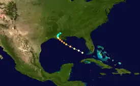A hurricane formed north of Hispaniola on August 25. It moved westward, passing over the Inagua Islands before striking the north coast of Cuba as a Category 2 hurricane on August 27. The cyclone weakened to Category 1 strength as it crossed the island, close to Matanzas, but regained first Category 2 and then Category 3 strength as it moved north through the Gulf of Mexico. The cyclone made landfall near Panama City, Florida, on August 31 as a Category 2 hurricane. Thereafter, it then quickly weakened to a tropical storm while moving northward through Georgia and South Carolina. The storm entered the Atlantic from the state of Virginia on next day and dissipated on September 3.[2]